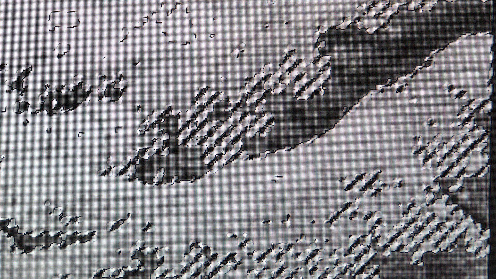 hier gezeigten Kamerafahrten von der Nahaufnahme eines Displays heraus, verschwindet die Rasterung ab einer gewissen Distanz, Quadranten fügen sich zu Linien und dann zu Konturen und Flächen. Gleichsam gewinnen die Konturen an Schärfe – der Vorgang beruht